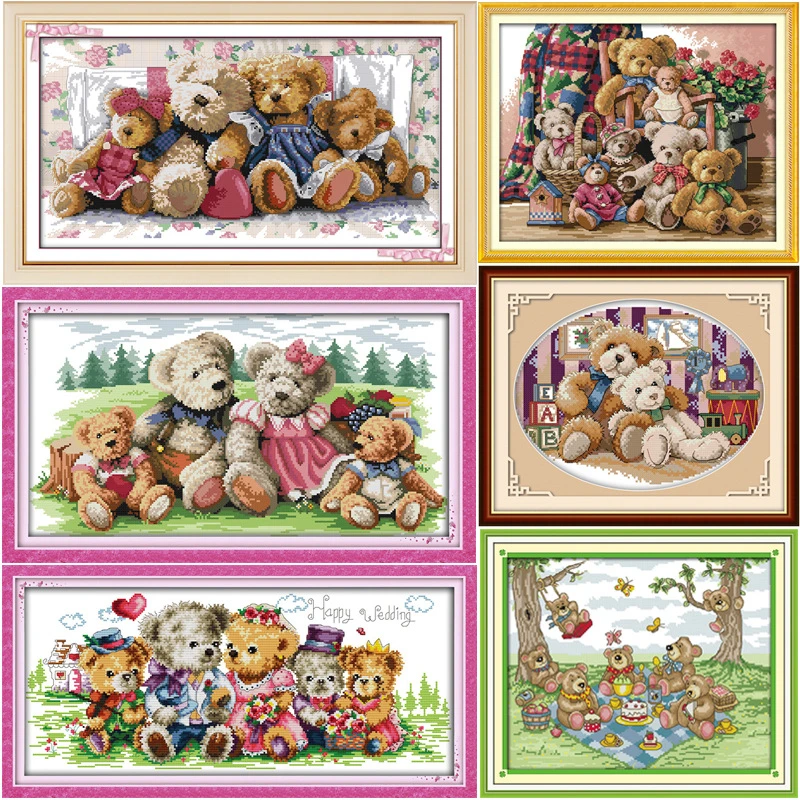 Happy Bear Family The Teddy Bear Dmc Frabric Diy Handwork Embroidery Chinese Cross Stitch Kits Cross Stitch Set Needlework Cross Stitch Aliexpress